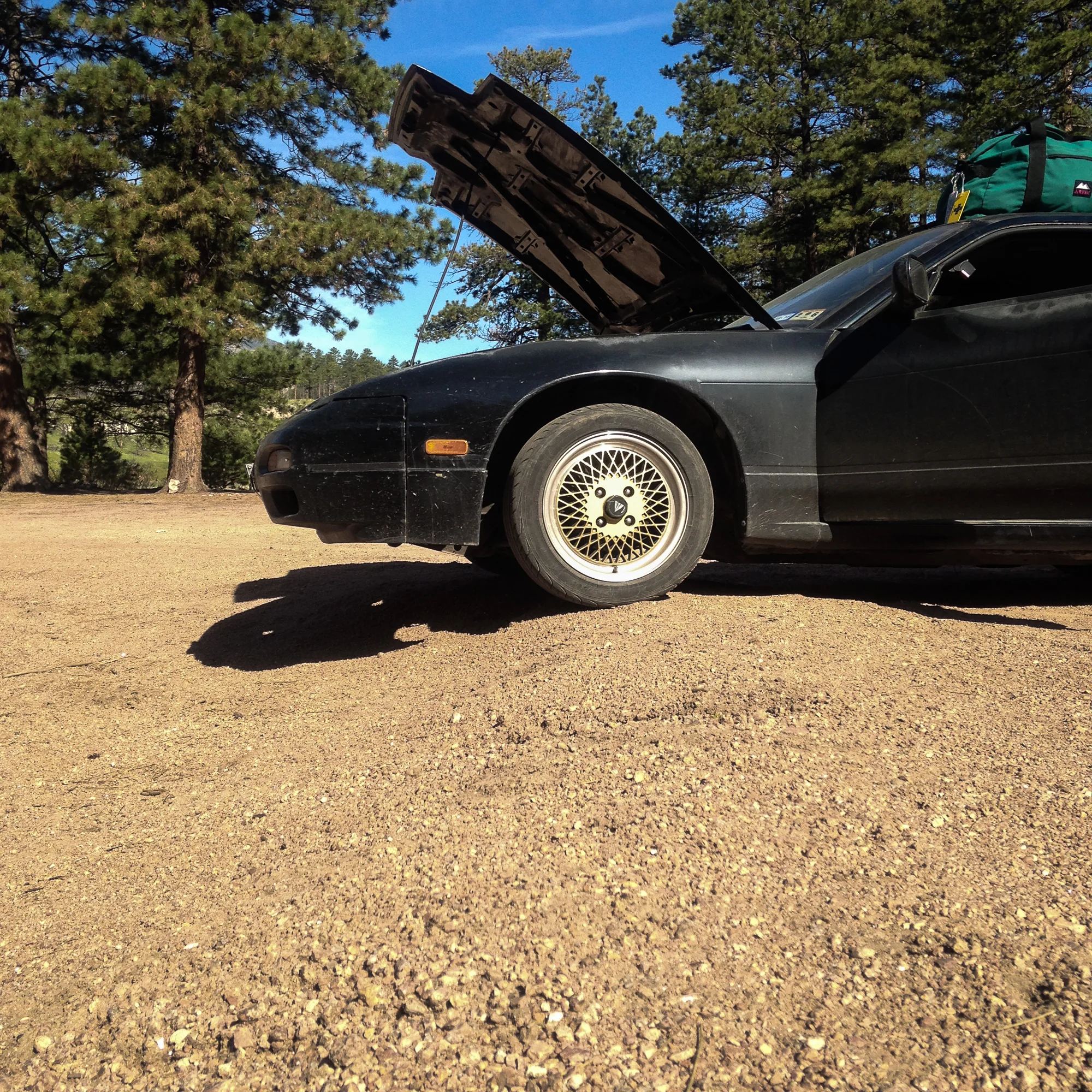 Shortly after our visitor left my friend finally wakes up and goes about making his breakfast. My belts are still squealing in the cold weather and with just my luck there is a trench dug out here that allows me easy access to the underside of my car this time. While I did bring a large variety of tools, getting access to the underside of a low sports car can prove to be the biggest issue at times. Now that I can finally get to the underside I find my problem. My alternator bolt is gone. Just a large hole where a bolt should have been. I’m baffled at how the bolt is just missing, however there is no one I can blame. After All I’m the only one who even works on my car in the first place. So with no extra hardware, something I didn’t think to bring, I opted for the most common solution a 240sx owner uses: zip ties.